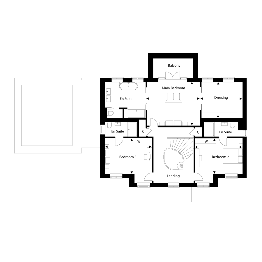 This exceptional home offers luxury living with breath-taking countryside views. The open-plan kitchen and dining area features a large island, walk-in pantry, family area, and French doors leading to the garden. A full-length living room, separate study/snug, and downstairs utility room provide space, comfort and practicality. The main bedroom boasts an en suite, dressing room, and private balcony with stunning views, while all other bedrooms also include an en suite. The two top-floor bedrooms also benefit from a private balcony, enhancing this living experience.